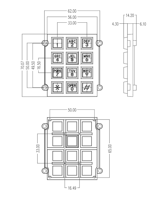 产品描述锌合金-12位-字母数字按键应用场合适用于ATM机、门禁系统、电梯、保险箱、自动售币机、密码锁、自助打单查询机、公共信息查询设备自动化监视、安防设备、工业PC数控平台、仪器检测设备、自助缴费机、石化厂、煤矿冶金、加油机、自助终端设备、各种电话机以及工业应用设备。