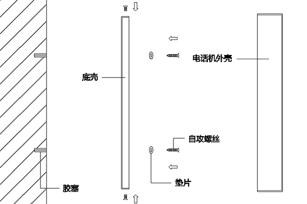 c. 利用配套的自攻螺丝和垫片,将电话机底板固定在胶塞上(或者用M4的螺丝和垫片,将电话机底板固定在轿厢壁上);