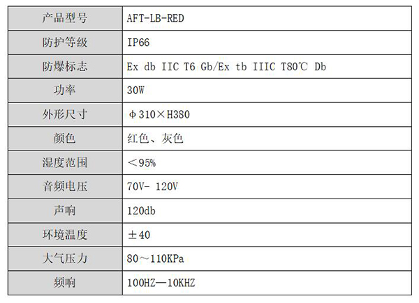 AFT-LB-RED 防爆防水扬声器采用隔爆设计,为隔爆型消防广播报警扬声器。安装于易燃易爆场所的公共区域,用于扩音和传递远距离声音和报警。结构设计合理,造型美观,有效抵御灰尘污染和潮湿空气影响。本产品符合GB3836.1—2000《爆炸性环境用防爆电气设备通用要求》,及GB3836.2—2000《爆炸性环境用防爆电气设备隔爆型“d”》标准,粉尘防爆 GB12467.1-2000可燃性粉尘环境用电气设备第1部分:用外壳和限制表面温度保护的电气设备,外壳防护等级IP66,GB/T 14048.1 低压开关设备和控制设备总则要求。