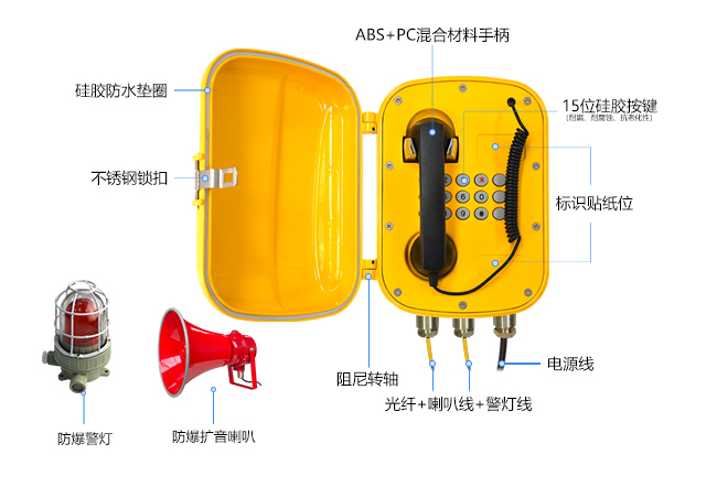 7. 扬声器与声光警灯防护等级为IP65,防爆等级为Exd IIC T6,具备防水、防爆、防潮等特点,可露天使用;