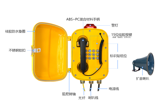 6. 话机外壳采用多重防水设计,所有进线位置均使用专业抗老化防水电子胶密封,话机整体防护等级达IP68;