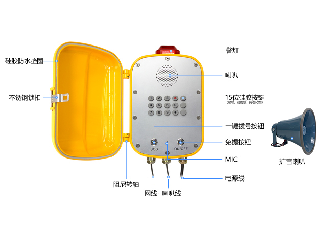 6. 话机外壳采用多重防水设计,所有进线位置均使用专业抗老化防水电子胶密封,话机整体防护等级达IP68;