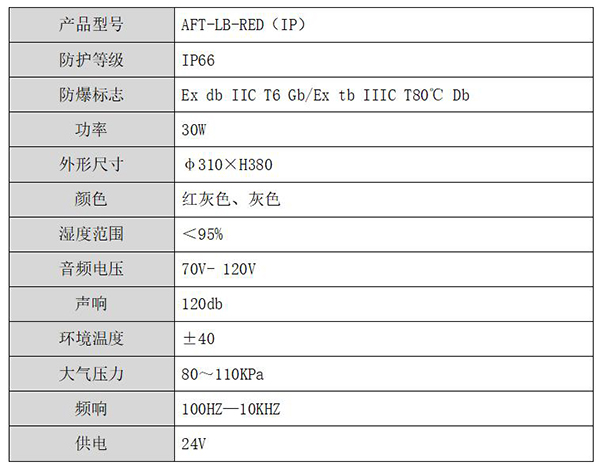 AFT-LB-RED 防爆防水扬声器采用隔爆设计,为隔爆型消防广播报警扬声器。安装于易燃易爆场所的公共区域,用于扩音和传递远距离声音和报警。结构设计合理,造型美观,有效抵御灰尘污染和潮湿空气影响。本产品符合GB3836.1—2000《爆炸性环境用防爆电气设备通用要求》,及GB3836.2—2000《爆炸性环境用防爆电气设备隔爆型“d”》标准,粉尘防爆 GB12467.1-2000可燃性粉尘环境用电气设备第1部分:用外壳和限制表面温度保护的电气设备,外壳防护等级IP66,GB/T 14048.1 低压开关设备和控制设备总则要求。