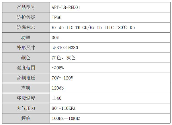 AFT-LB-RED01 防爆防水扬声器采用隔爆设计,为隔爆型消防广播报警扬声器。安装于易燃易爆场所的公共区域,用于扩音和传递远距离声音和报警。结构设计合理,造型美观,有效抵御灰尘污染和潮湿空气影响。本产品符合GB3836.1—2000《爆炸性环境用防爆电气设备通用要求》,及GB3836.2—2000《爆炸性环境用防爆电气设备隔爆型“d”》标准,粉尘防爆 GB12467.1-2000可燃性粉尘环境用电气设备第1部分:用外壳和限制表面温度保护的电气设备,外壳防护等级IP66,GB/T 14048.1 低压开关设备和控制设备总则要求。