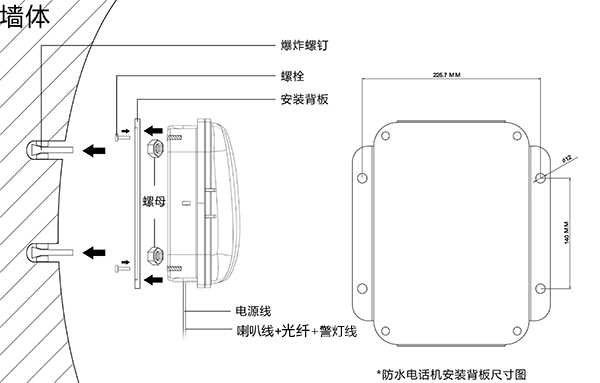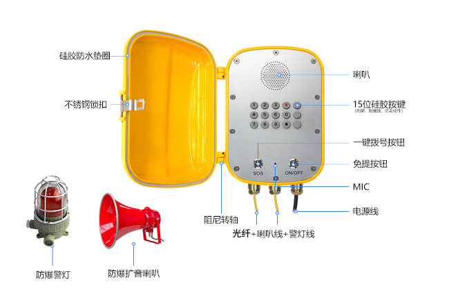 防爆光纤免提防水声光扩音电话机支持标准SIP协议,可以有效兼容市面常用IPPBX以及网络调度平台,是专门针对地铁隧道、地下管廊隧道、高速公路隧道、矿山矿井、电厂电站、钢铁厂、港口、船舶、电解车间等高潮湿、高粉尘环境而研发的特种电话机,适合长期安装在各种恶劣环境使用,具备防水、防潮、防尘、防寒、抗冻、耐高温、抗氧化、抗腐蚀、抗暴力敲击等特性。