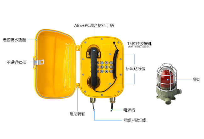 防爆IP防水电话机支持标准SIP协议,可以有效兼容市面常用IPPBX以及网络调度平台,是专门针对地铁隧道、地下管廊隧道、高速公路隧道、矿山矿井、电厂电站、钢铁厂、港口、船舶、电解车间等高潮湿、高粉尘环境而研发的特种电话机,适合长期安装在各种恶劣环境使用,具备防水、防潮、防尘、防寒、抗冻、耐高温、抗氧化、抗腐蚀、抗暴力敲击等特性。