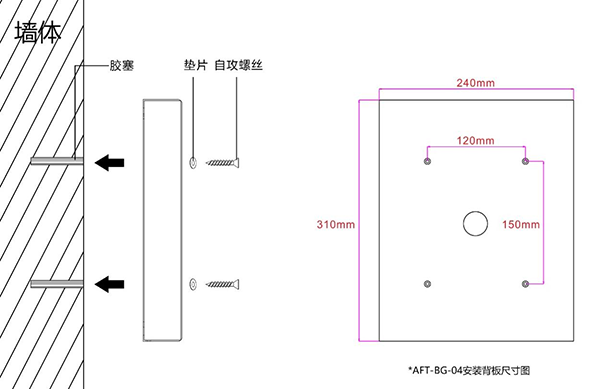 a. 在墙面上根据安装孔位尺寸钻4个Φ6的孔(150×120mm),并塞入胶塞;