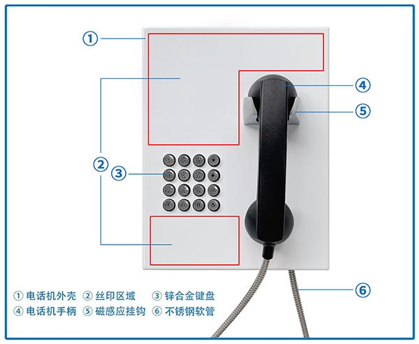1. 冷轧钢材质,表面喷涂高档户外粉漆,具备防寒、抗冻、防尘、防潮、耐磨、抗暴力敲击等特点;手柄选用德国拜耳ABS+PC合金材料,采用一体抽空成型结构。内部选用军工级送受话器,并装有永磁磁钢。具备防爆、防水、防潮、防尘、抗噪、防寒、抗冻、抗暴力敲击等特性;