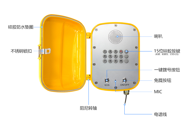 5. 话机外壳采用多重防水设计,所有进线位置均使用专业抗老化防水电子胶密封,话机整体防护等级达IP68;