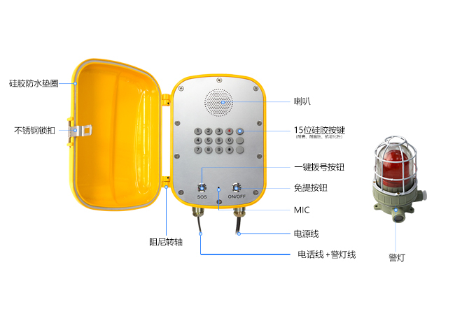 免提声光防水电话机可以与市面上众多品牌的程控电话交换机兼容,是专门针对地铁隧道、地下管廊隧道、高速公路隧道、矿山矿井、电厂电站、钢铁厂、港口、船舶、电解车间等高潮湿、高粉尘环境而研发的特种电话机,适合长期安装在各种恶劣环境使用,具备防水、防潮、防尘、防寒、抗冻、耐高温、抗氧化、抗腐蚀、抗暴力敲击等特性。