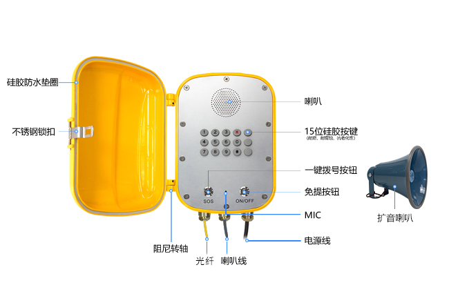 6. 话机外壳采用多重防水设计,所有进线位置均使用专业抗老化防水电子胶密封,话机整体防护等级达IP68;