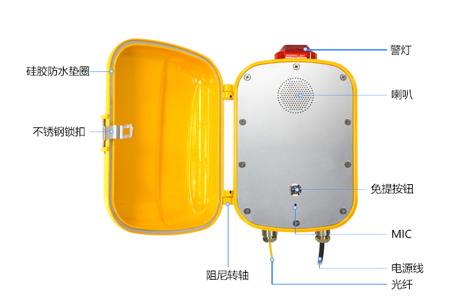 光纤一键呼叫免提防水电话机支持标准SIP协议,可以有效兼容市面常用IPPBX以及网络调度平台,是专门针对地铁隧道、地下管廊隧道、高速公路隧道、矿山矿井、电厂电站、钢铁厂、港口、船舶、电解车间等高潮湿、高粉尘环境而研发的特种电话机,适合长期安装在各种恶劣环境使用,具备防水、防潮、防尘、防寒、抗冻、耐高温、抗氧化、抗腐蚀、抗暴力敲击等特性。