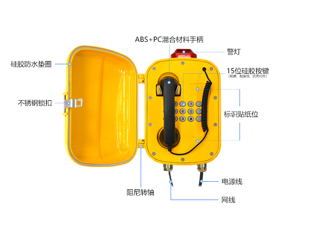 6. 话机外壳采用多重防水设计,所有进线位置均使用专业抗老化防水电子胶密封,话机整体防护等级达IP68;