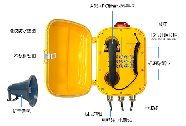 6. 话机外壳采用多重防水设计,所有进线位置均使用专业抗老化防水电子胶密封,话机整体防护等级达IP68;