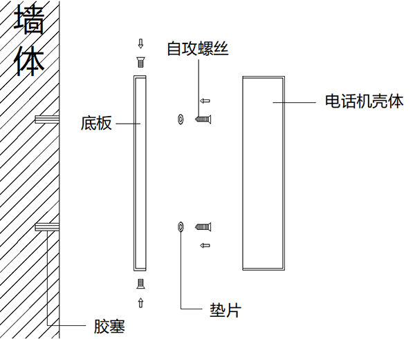 c. 利用配套的自攻螺丝和垫片,将电话机底板固定在胶塞上(或者用M4的螺丝和垫片,将电话机底板固定在轿厢壁上);