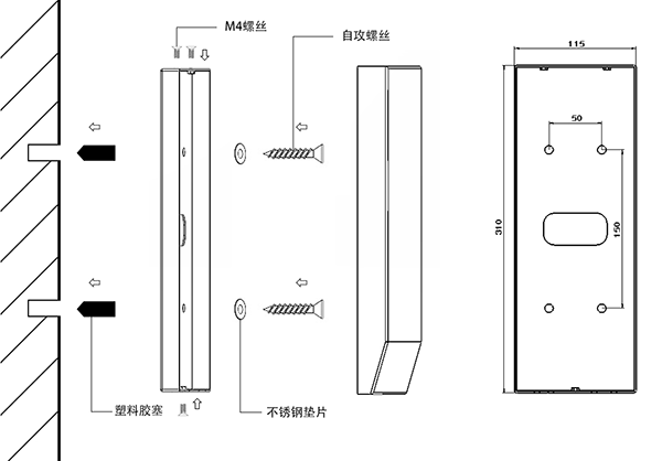 a. 在墙面上根据安装孔位尺寸钻4个Φ6的孔(150×50mm),并塞入胶塞;